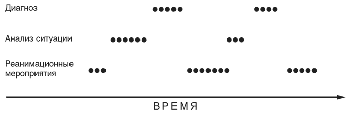 В тех бригадах, которые разрешили загадку, типичная последовательность переговоров выглядела как на приведенном ниже рисунке. На нем точками представлены высказывания реаниматологов по поводу реанимационных мероприятий, анализа ситуации и диагноза.