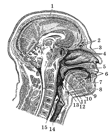 Рис. 26. Сагиттальный разрез головы и шеи по срединной плоскости: 1 – свод черепа; 2 – лобный синус; 3 – носовая кость; 4 – носовые раковины (верхняя, средняя, нижняя); 5 – ротовая полость; 6 – преддверие рта; 7 – язык; 8 – нижняя челюсть; 9 – отверстие слуховой трубы; 10 – подбородочно-подъязычная мышца; 11 – язычок; 12 – челюстно-подъязычная мышца; 13 – нёбная миндалина; 14 – трахея; 15 – пищевод.
