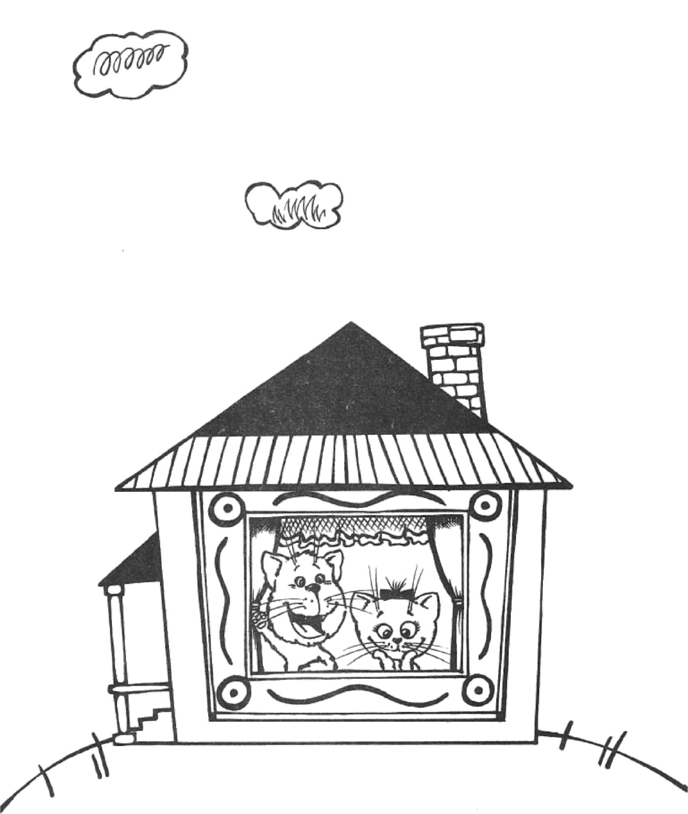 Вот подул ветер: фуу-у-ф (рисуем ветер произвольными линиями внизу листа, под текстом). Начала темнеть туча (рисуем тучу над домиком произвольными штрихами либо круговыми движениями).