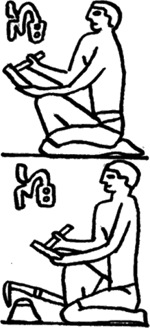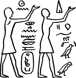 И снова прошло много-много лет. Примерно 5000 лет назад на севере Африки в Египте на берегу реки с названием Нил жил народ. Он оставил после себя множество рисунков. Одни из них были нацарапаны на камне, другие вырезаны, а третьи нарисованы на бумаге. Камни люди находили в природе вокруг себя, а бумагу делали из коры тростника, который рос на берегу Нила и назывался «папирус». Для изображения знаков-символов на папирусе человек использовал сначала кисточку, а затем перо.