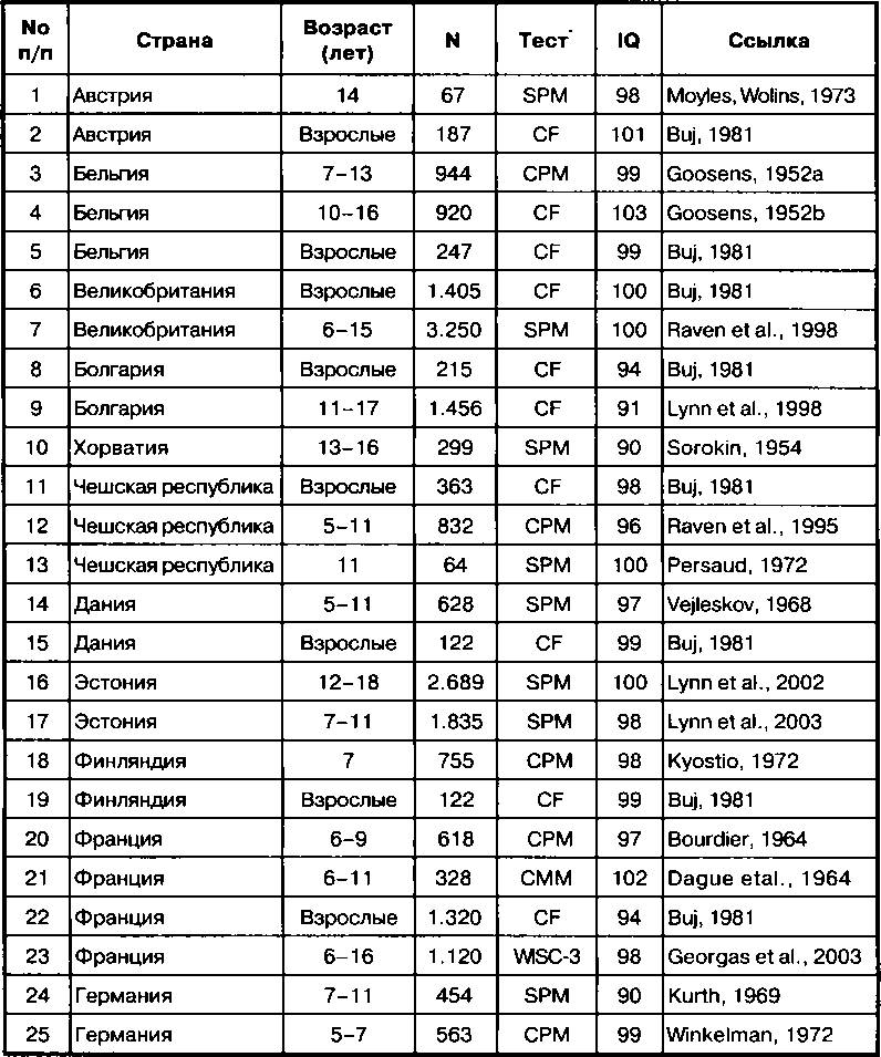 Таблица 3.1. Величины IQ автохтонных европейцев