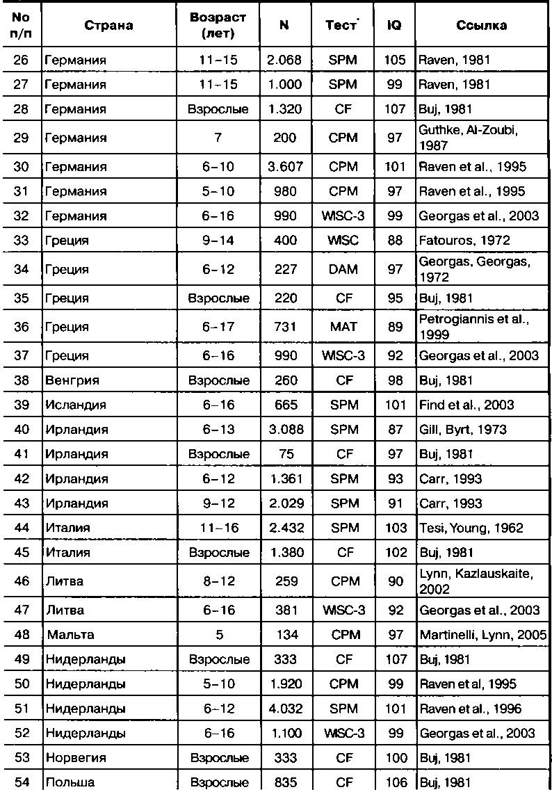 Величины IQ были рассчитаны относительно среднего значения IQ британцев, принятого за 100 (при стандартном отклонении в 15 единиц). В таблице представлены результаты двадцати одного исследования, выполненных (Buj, 1981) на выборках взрослых из больших городов. Большая часть исследований была выполнена с использованием одной из трёх версий прогрессивных матриц (СРМ, SPM и АРМ[4]). Представленный в строке 61 коэффициент интеллекта для Сербии в 89 баллов надо, вероятно, считать несколько заниженным, т. к. выборка, как она описана, была из «семей преимущественно из низшего и нижней части среднего классов» из Белграда и его окрестностей (Moyles и Wolins, 1973, стр. 372). Диапазон величин IQ европейцев составляет от 87 баллов по данным одного из исследований в Ирландии и 88 баллов в одном исследовании в Греции, до 107 баллов по данным одного исследования в Германии и Нидерландах. Имеются некоторые противоречия результатов разных исследований, выполненных в одних и тех же странах, где показатели интеллекта обычно различаются на два-три балла IQ, а в случаях Португалии и Польши — на целых 13 и 14 единиц, соответственно. Эти различия частично вызваны ошибками выборок, но отчасти отражают действительные различия, обусловленные разницей в жизненном уровне и, возможно, неоднородностью расового состава европейских популяций. Ошибки выборок в исследованиях интеллекта в национальных популяциях возникают таким же образом, как при опросах о том, за кого намерены голосовать респондены, где обычно результаты нескольких опросов, выполненных в одно и то же время, дают результаты, различающиеся на несколько процентов. Нам не следует искать причины незначительных различий величин IQ в разных исследованиях, поскольку во многих случаях это просто ошибки выборки. Важно выявить основные паттерны.