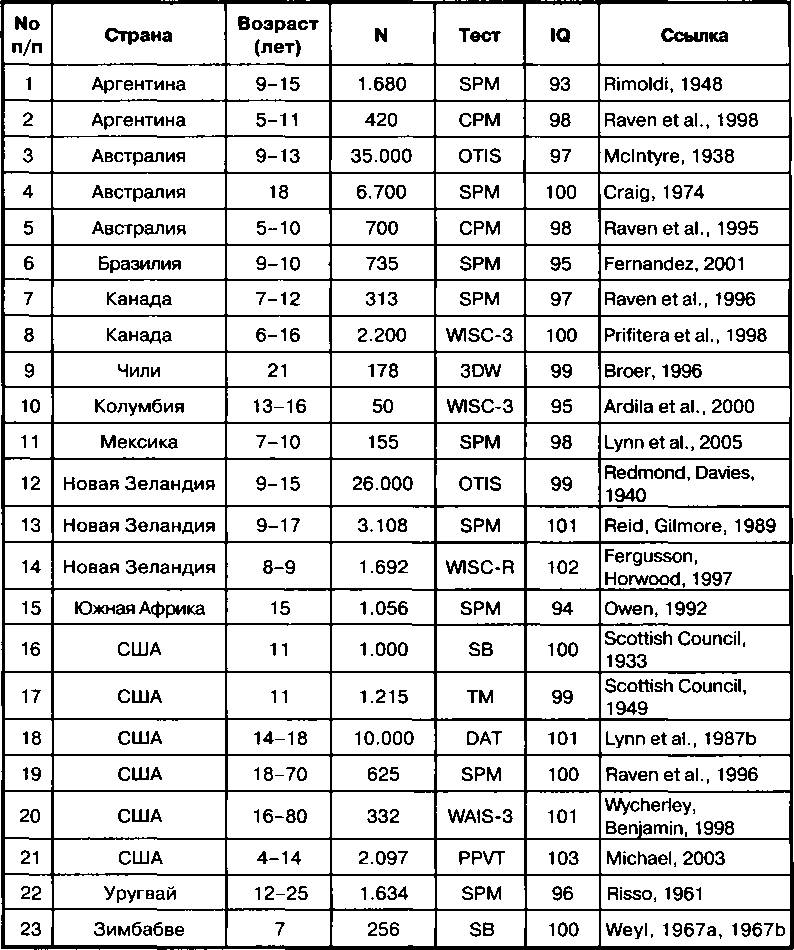В строках 1 и 2 приведены значения IQ в 93 и 98 баллов для Аргентины. В строке 3 представлен IQ в 97 баллов для Австралии, основанный на стандартизации американского теста Отиса. В строке 4 представлен IQ 100 для Австралии, измеренный у военнослужащих с помощью теста SPM (Величина IQ в этой выборке составляла 102 балла, но так как оценки мужчин по этому тесту в среднем на 5 баллов выше, чем у женщин (Lynn, Irwing, 2004), среднее значение было уменьшено до 100). В строке 5 приведён IQ 98 по выборке малолетних австралийских детей. Строка 6 дает IQ 95 для европеоидных детей в Бразилии из г. Сан-Паулу. В строке 7 представлен IQ 97 для Канады, полученной в выборке 7-12 летних детей. Строка 8 даёт IQ 100 для Канады, полученный из стандартизации теста WISC-3 на репрезентативной выборке в 2.200 детей возраста 6-16 лет.