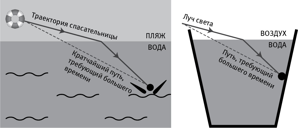 Чтобы скорее добраться до тонущего купальщика, спасательнице надо двигаться не по прямой (изображенной пунктиром), а по ломаной линии, выигрывая время за счет того, что по берегу она может двигаться быстрее, чем плыть в воде. Луч света в воде подчиняется тому же правилу: преломившись, он достигает дна или стенки сосуда за кратчайшее время.