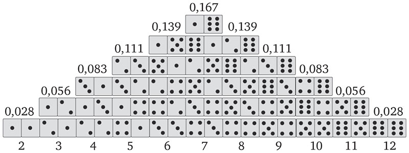 Кардано пришла в голову удачная мысль подсчитать число возможных вариантов выпадения костей. В случае броска двух костей таких вариантов 36. Они изображены на следующей схеме.