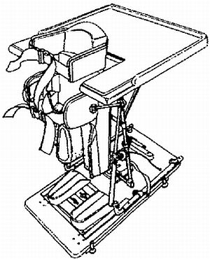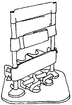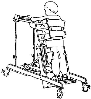 В 1993 году Элизабет Грин (Е. Green) и ее коллеги провели подробное исследование особенностей вертикальной позы ребенка, который еще только учится стоять, и проблем, которые возникают при использовании стендеров и стояков, имеющихся в настоящее время в продаже. Были установлены терапевтические требования к стоякам: они должны поддерживать правильную позу в положении стоя и обеспечивать ребенку возможность двигаться, перенося вес тела, в пределах площади опоры, прежде чем он сможет двигаться за ее пределами. На основании данных требований эта группа ученых разработала вертикальный стояк «Чейли» (The Chailey Standing Support) (рис. 8.9).