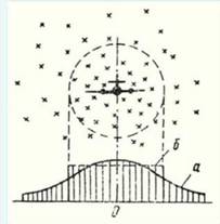 а – действительный закон распределния попаданий; б – закон равновероятного распределения попаданий.