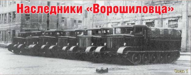 Вверху: шесть тягачей АТ-45 опытной партии во дворе завода №75 на фоне разрушенных цехов ХПЗ. Лето 1944 г.