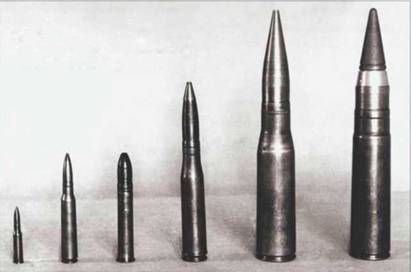 Некоторые авиационные боеприпасы (слева направо): патрон к пулемету ШКАС калибра 7,62 мм; патрон к пулемету УБС калибра 12,7 мм; патрон к пушке ШВАК калибра 20 мм; патрон к пушке ВЯ-23 калибра 23 мм; патрон к пушке НС-37 калибра 37 мм и патрон к пушке НС-45 калибра 45 мм.