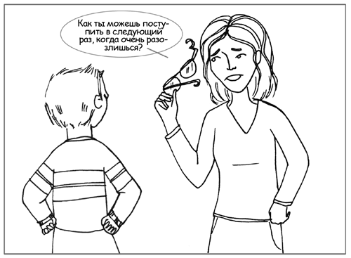 Затем спросите его, как он может поступить в следующий раз, когда очень сильно рассердится. Обсудите, каким образом вы могли бы помочь ему успокоиться так, чтобы ему это было приятно. Это обсуждение углубит представления ребенка о том, как важно контролировать эмоции, беречь взаимоотношения с близкими, предвидеть последствия своих поступков, выражать свои переживания приемлемым образом и т. д. Кроме того, вы продемонстрируете ребенку, как высоко цените его мысли и суждения.