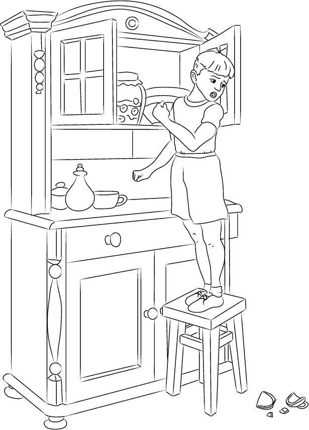 2. Жил-был маленький мальчик, которого звали Анри. Однажды, когда его матери не было дома, он захотел взять из буфета варенье. Малыш встал на стул и протянул руку. Но варенье было слишком высоко, и он не мог до него дотянуться. Пытаясь его достать, Анри зацепил чашку. Чашка упала и разбилась.