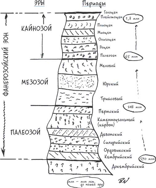 Вы наверняка встречались с такими терминами, как мезозойская эра, юрский период и каменный век. Эти словосочетания происходят из геологии. На протяжении большей части истории Земли жизнь на планете всего лишь стремительно набирала обороты. В основном живые существа были представлены одноклеточными организмами или относительно простыми мягкотелыми животными. Практически все самое интересное началось как раз в последние 500 млн лет. Почти все существа, о которых вы когда-либо слышали, от трилобитов до динозавров и неандертальцев, появились именно в это время. Все эти годы в настоящее время считаются частью одного-единственного геологического эона, который носит замечательное имя: фанерозойский эон (от греческого «фанерос», то есть видимый, явный). Фанерозой, в свою очередь, делится на три геологические эры: палеозой, мезозой и кайнозой. Последняя эра – это та, в которую мы живем. Грубо говоря, названия этих эр означают «старые животные», «средние животные» и «новые животные» (в том числе и мы). Наконец, эти эры делятся на эпохи. Наша эпоха называется голоцен, или «новая», и охватывает последние 10 тысяч лет, то есть примерно одну пятисоттысячную часть всей истории планеты. Взгляните на мою схему.