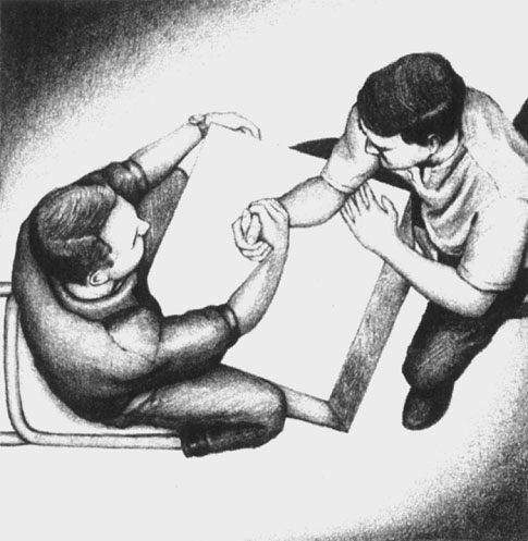 Затем я обращаюсь к слушателям в первом ряду и спрашиваю, согласны ли они спонсировать соревнование: если я положу руку соперника, то получу десять центов, а если он положит мою, то десять центов получит он. Слушатели соглашаются. Затем я прошу одного из них вести счет, потому что каждый раз, когда рука коснется стола, один из нас должен получить десять центов. Потом я прошу выделить нам на борьбу тридцать секунд и дать сигнал, когда начинать. После этого мы хватаемся руками и, сверля друг друга глазами и строя страшные гримасы, ждем сигнала.