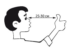 1. Расположить палец левой руки параллельно средней линии лица на расстоянии 25–30 см от глаз.