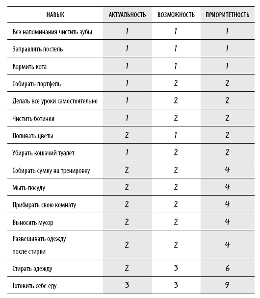 Начинать приучение к самостоятельности надо с первых верхних строчек — то есть с того, что наиболее актуально и легко осуществимо. Опыт подсказывает, что дела, перечисленные в этой таблице, потребуют воспитательных усилий на полгода.