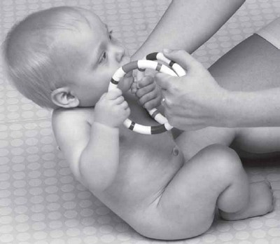 Для развития мускулатуры полезны ритмичные движения. Мы побуждаем малыша подниматься до сидячего положения, но не сидеть. Самостоятельно садиться ребенок будет только после того, как научится ползать. Можно облегчить ребенку переход из полусидячего положения в лежачее, слегка раскачивая его вперед-назад или из стороны в сторону. Детей это очень радует. Ребенок, уже знакомый с этой игрой, будет крепко держаться за кольца, чтобы не упасть. Со временем он сможет держаться за кольца одной рукой.