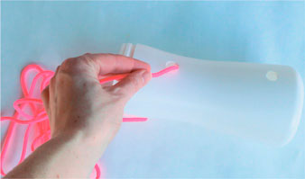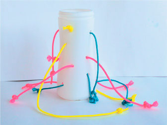 2 Проденьте веревку, ленту или бечевку через любые два отверстия и с обоих концов завяжите на ней узелки такого размера, чтобы она не выскользнула. Таким же образом заполните все отверстия.