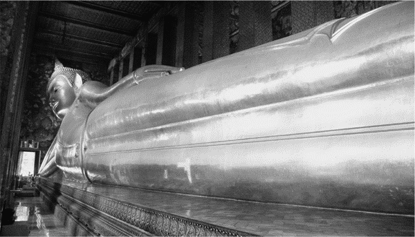 Существует много статуй лежащего Будды, одна из самых больших достигает 46 метров в длину и 15 метров в высоту. Она сделана из гипса и обожженных кирпичей, покрыта тонким слоем листового золота, ее ступни украшены перламутровыми инкрустациями, а находится этот Будда в храмовом комплексе Ват По, историческом центре Бангкока. Он уже давно пребывает в этой позе, не меньше 200 лет. Лежа на правом боку, он опирается головой на руку. Сердце его свободно от всяких переживаний. Он спит и даже в этой позе сохраняет равновесие – настолько он погружен в свои грезы, ничто не беспокоит его, ничто не заставляет изменить положение. Он еще здесь или уже там? Давайте запомним, как выглядит это спокойное лежание, которому можно только позавидовать.