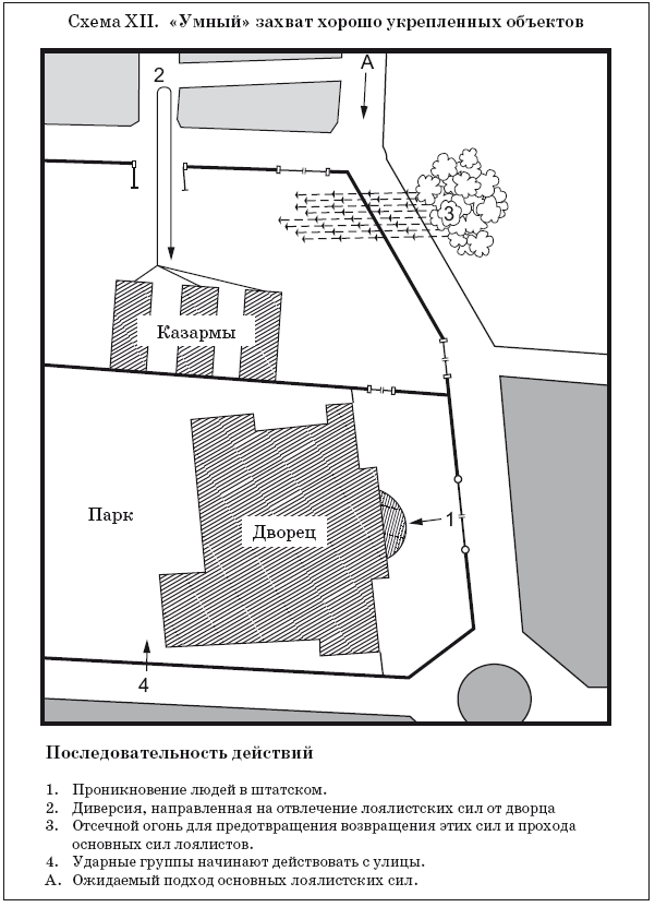 б) «Диверсионная» группа. Ее значение зависит от сил, обороняющих тот или иной объект. Там, где, как в случае с королевским или президентским дворцом, объект будет охранять целое пехотное подразделение, ключевую роль может сыграть диверсия, направленная на отвлечение части сил защитников. Диверсионная группа выполнит свою задачу, создав ложную тревогу или совершив нападение на расположенную поблизости второочередную цель. Время диверсии должно быть рассчитано так, чтобы лоялисты успели среагировать и направить силы к месту ее проведения, после чего будет совершено нападение на основную цель.