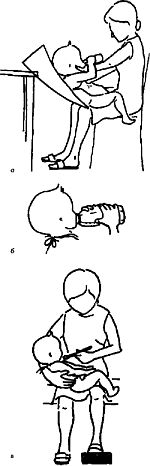 Рис. 18.1. а – кормление из бутылочки. Если это необходимо, мама надавливает ладонью на грудь малыша и контролирует его рот, пока он сосет; б – ребенок охватывает бутылочку руками; в – правильное положение: ребенка кормят в положении полусидя, голова наклонена вперед, руки выведены вперед.