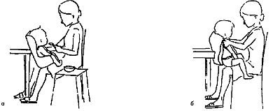 Рис. 18.2. а – положение полусидя для ребенка, который может удерживать равновесие. Помните: тарелка с едой должна стоять перед ребенком. Дополнительную опору дает детское сиденье, его можно прислонить к краю стола; б – ребенок хорошо сидит сам. Если его посадить прямо и развести его ноги, он согнет их в тазобедренных суставах. Можно поддерживать малыша за плечи.