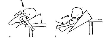 Рис. 18.3. Ребенок находится напротив матери и опирается на клин, который прислонен к краю стола; а – неправильно. За положением тела ребенка не следят, ложку подносят сверху; малыш запрокидывает голову и не может глотать; б – правильно. Мама надавливает ладонью на нижнюю часть груди ребенка, ложку подносит спереди и прямо – так ребенку легче контролировать положение головы и глотать.