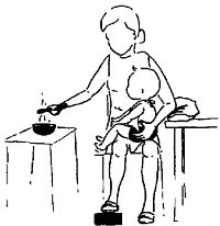 Рис. 18.4. Ребенка кормят, посадив на колени. Чтобы препятствовать выгибанию туловища и запрокидыванию головы, мама ногой поддерживает ноги малыша под коленями. Мамина нога стоит на скамеечке для того, чтобы сильнее согнуть ноги малыша в тазобедренных суставах. Поясницу и плечи ребенка поддерживают рукой, опираясь ею на край стола, подложив подушку. Еда должна находиться перед ребенком.