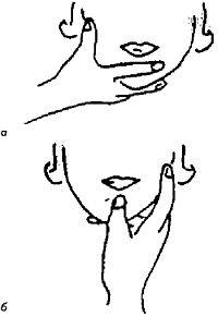 Рис. 18.5. а – управление ртом ребенка, когда он находится справа от мамы. Мамина рука проходит за головой малыша, ее кисть контролирует рот: большой палец – на нижнечелюстном суставе, указательный – на подбородке, средний – под подбородком и постоянно подпирает его; б – управление ртом ребенка, когда он находится перед мамой: большой палец – на подбородке, указательный – на нижнечелюстном суставе, средний – поддерживает подбородок.