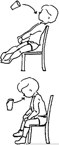 Главное условие правильного питья – закрытый рот. Челюсти должны быть сомкнуты, а губы – охватывать край стакана. При соблюдении этих условий ребенок сможет втягивать жидкость губами и глотать ее, не захватывая воздух. Наклоните стакан так, чтобы жидкость коснулась верхней губы малыша, а остальное он сделает сам. Нельзя убирать стакан после каждого глотка, пусть малыш держит его край губами, в противном случае он потянется за стаканом, и вы потеряете контроль над его ртом и положением головы. Легче всего пить густые жидкости, например йогурт, с них и надо начинать обучение. Кислые напитки вызывают обильное слюноотделение и пить их труднее всего.