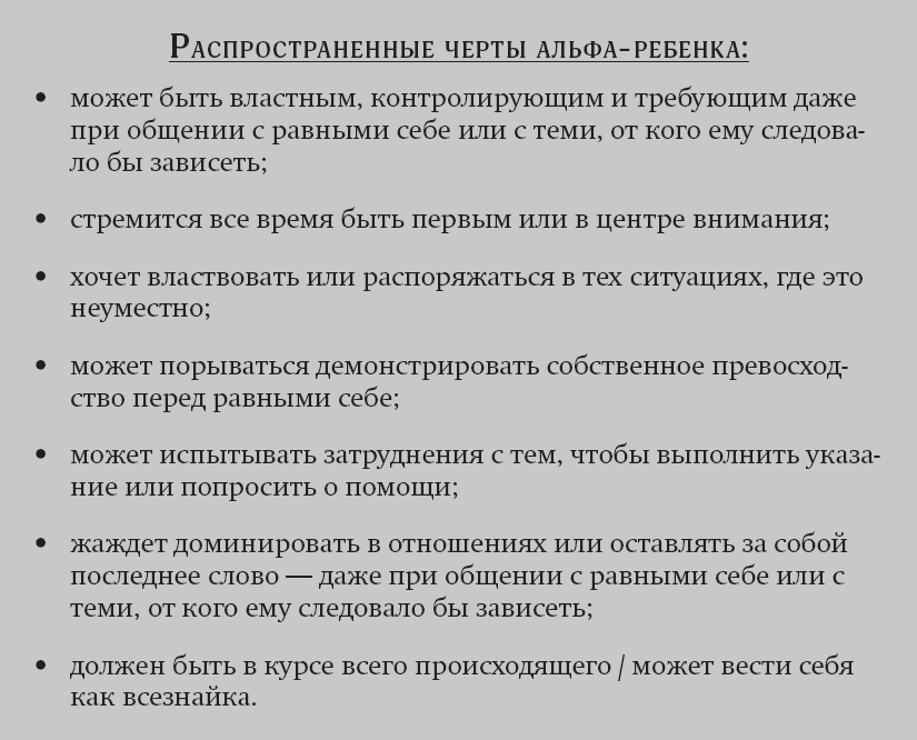 Сегодня среди дошкольников широко распространена проблема альфа-детей (помимо ориентации на сверстников, о которой мы говорили в главе 4). Проблемы с альфа-позицией возникают, когда естественная иерархия привязанности оказывается перевернутой, то есть когда ребенок занимает позицию альфы вместо того, чтобы оставаться в позиции зависящего в отношениях со взрослыми. Когда зависимость перестает быть безопасной, инстинкты и эмоции побуждают ребенка в альфе доминировать над взрослым, чтобы руководить его заботой. Вместо того чтобы слушаться взрослого, такие дети командуют, указывая, какие у них потребности и как о них нужно заботиться. Вместо того чтобы выполнять указания, альфа-ребенок ожидает, что родители будут подчиняться его желаниям и требованиям. Такие дети руководят взаимодействием со взрослыми, иногда даже притворяясь беспомощными, чтобы вызвать желание позаботиться. Они инстинктивно стремятся считать себя главными, вытесняя родителей из роли альфы.