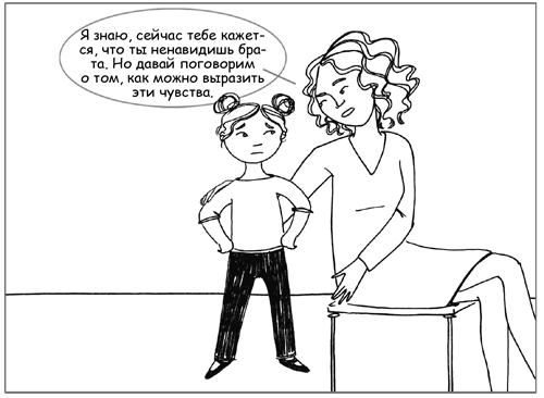 Например, можно сказать: «Я знаю, что тебе хочется забрать магазинную тележку домой. Было бы здорово с ней поиграть. Но она должна оставаться здесь, в магазине, чтобы другие покупатели тоже могли ею воспользоваться, когда придут за покупками». Или: «Охотно верю, что сейчас тебе кажется, будто ты на самом деле ненавидишь брата. В детстве я так же себя чувствовала, когда сестра меня бесила. Но люди не должны кричать друг другу: “Я тебя убью!” Нет ничего ужасного в том, чтобы взбеситься, и ты имеешь полное право сказать об этом брату. Но давай обсудим, как это можно выразить иначе». Принимайте чувства, даже если отвергаете поведение.