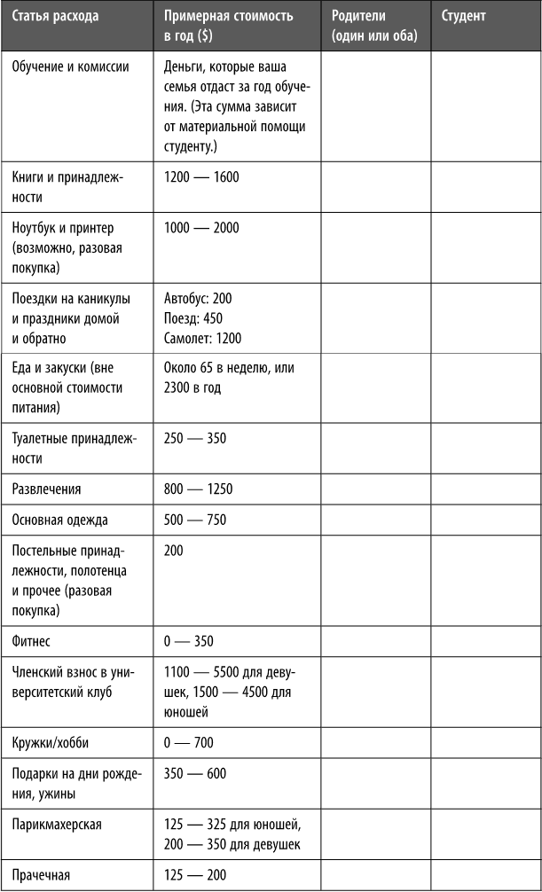 • Подыскивайте учебники по сходной цене. По некоторым оценкам, студенты тратят около 1200 долларов на учебники и канцелярские принадлежности ежегодно. Согласно результатам одного опроса, около 65 % студентов не покупают хотя бы один нужный учебник из-за его высокой стоимости. Но зачем платить 400 долларов за новый учебник, если можно купить подержанный за 200? (Да, родители детей предстуденческого возраста, это столько стоят учебники у нас в Америке.) Если вы научите ребенка искать варианты покупки учебников, он и в дальнейшей жизни будет искать выгодную цену. Почему я не пишу про библиотеки? По той простой причине, что бесплатных учебников не хватает, тут действует принцип «кто первый пришел, тот и взял». Но книги, в том числе учебники, можно заказать на таких сайтах, как Amazon.com, Barnes&Noble.com, Half.com и Chegg.com, – это выйдет дешевле. Теперь во многих колледжах учебники предлагают в электронном виде, и их стоимость меньше. Если ваш ребенок решил купить именно книгу (в бумажном варианте), он почти всегда может потом продать ее, а при продаже через Интернет даже выручить больше, чем рассчитывал.