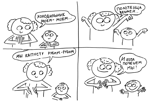 Ребенок в своем развитии как будто повторяет этапы развития человечества. Первой формой общения людей друг с другом, до того как они освоили вербальную речь, были жесты. Маленький ребенок тоже начинает общаться жестами. Он пальчиком показывает на то, что ему нужно, еще до того, как сможет озвучить свою просьбу. Первый диалог с окружающими — жестовый. Почему так радуют детей все эти «ладушки-ладушки», «сороки-вороны» и другие пальчиковые игры? Потому что это уже диалог. Своеобразный, но диалог. Происходит обмен информацией. Взрослый говорит, а ребенок выполняет соответствующее движение руками, таким образом вступая в обратную связь со взрослым: «Я услышал тебя, я узнал слова, понял их значение, я помню, что нужно делать, когда я это слышу». Возникает обоюдная радость установленного контакта.