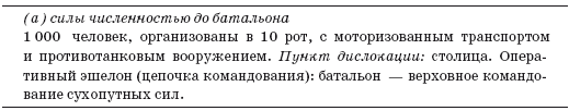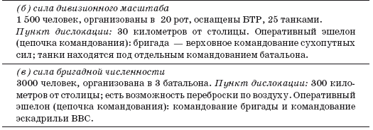 Наше первоначальное исследование вооруженных сил в стране, выбранной мишенью для переворота, выявило две категории сведений, ключевых с точки зрения планирования переворота. Речь идет о виде и составе частей, способных вмешаться в события, и реальном оперативном эшелоне командования внутри них. Эти данные иллюстрирует приводимая ниже наглядная таблица: