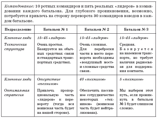 Чтобы привлечь то или иное подразделение к участию в перевороте, необходимо заручиться активным сотрудничеством ряда его «лидеров». В случае технически простых подразделений отпадение некоторых технических специалистов не составит для нас большой проблемы. Если же в достаточно «подготовленных» к участию в перевороте подразделениях некоторые «лидеры» останутся лояльными прежнему режиму, это не станет серьезным препятствием[50].
