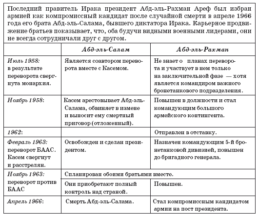 Последний правитель Ирака президент Абд-эль-Рахман Ареф[57] был избран армией как компромиссный кандидат после случайной смерти в апреле 1966 года его брата Абд-эль-Салама, бывшего диктатора Ирака. Карьерное продвижение братьев показывает, что, оба будучи видными военными лидерами, они не всегда сотрудничали друг с другом.