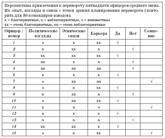 Вся техника подхода направлена на то, чтобы обезоружить эту логику. Помимо награды за участие в успешном перевороте (которую можно представить как гораздо более соблазнительную, чем награда за лояльность) есть и еще один фактор, который будет работать в нашу пользу. Он состоит в том, что лицо, которому офицер доложит о подходе, может оказаться сторонником переворота. Поэтому оба эти пункта нужно подчеркивать как можно сильнее, в тоже время уменьшая в разговоре опасность потенциального риска. Но мы надеемся, что у наших потенциальных сторонников будет и иная мотивация помимо жадности и страха, и на их выбор повлияют другие факторы. Дружеские связи с заговорщиками и общие политические взгляды могут быть важны, но обычно главными факторами при принятии решения оказываются семейные, клановые и этнические связи с теми, кто планирует переворот.