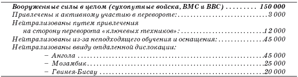 ВМС. У португальцев есть великая мореходная традиция, и наличие «заморских» территорий, казалось, оправдывало бы наличие большого флота, который мог бы частично финансироваться за счет программ военной помощи США. Но по причинам, описанным ниже, флот Португалии поддерживался в относительно слабом состоянии: один эсминец, четырнадцать малых боевых кораблей, три подводных лодки и тридцать шесть других судов. При этом для нас имеют особый интерес двенадцать вспомогательных кораблей, четыре десантных судна и полбатальона морских пехотинцев. Даже если бы ВМС остались особенно лояльными по отношению к режиму, из-за отдаленности африканских провинций они не успели бы быстро перебросить достаточное количество войск из Африки в Португалию. Морские пехотинцы обычно находятся далеко от страны, и их численность не очень значительна.