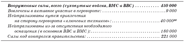 Из этого вытекают принципиальные критерии, по которым мы разделяем силы, ключевые с точки зрения возможного переворота, безотносительно того, вооружены они или нет. Силами, имеющими значение с точки зрения возможного переворота, являются те, которые с учетом своей дислокации и/или оснащения способны вмешаться в события в районе своего размещения (обычно в столице) в течение 12–24 часов, необходимых им для установления контроля над государственной машиной.