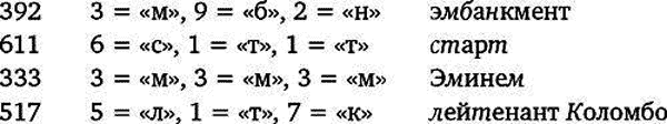 Какой во всем этом смысл? Джеймс запоминает цифры группами по три. Каждое трехзначное число — конкретный образ. Например, 615 — это всегда «шаттл», 392 — станция «Эмбанкмент» лондонского метро, 611 — Лесли Нильсен, 333 — Эминем, а 517 — лейтенант Коломбо. Пролить свет на эти образы позволяет другое мнемоническое правило: с каждой цифрой от 0 до 9 Джеймс связал звук английской речи. Цифра 6 — это всегда «ш» или «с», 1 — это «т» или «д», а 5 — «л». Именно поэтому образом числа 615 — «ш-т-л» — стал «шаттл». Практически любое трехзначное число от 000 до 999 существует в уме Патерсона в виде уникального образа, построенного на соответствующих звуках. Например, в ходе нашего импровизированного испытания он представил такие картинки, помимо космического челнока: