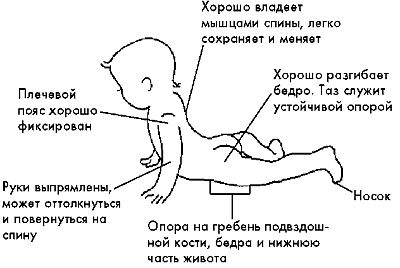 В положении лежа на животе преобладает разгибание. Ребенок отталкивается прямыми руками, но когда он переносит вес на одну руку, то сгибает ее, обеспечивая устойчивость позы.