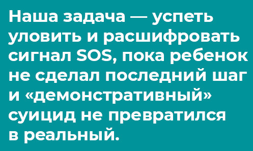 Анализируя, что толкает детей на суицид, как правило, называют не причины, а поводы – очевидные, событийные, те, что лежат на поверхности: смерть близкого человека, изнасилование, незапланированная беременность, конфликты с родителями и в школе, несданный экзамен, неразделенная любовь. С причинами все гораздо сложнее. Я бы выделила три весомые причины: это кризис подросткового возраста, дефицит любви и внимания, отсутствие опыта фрустрации.