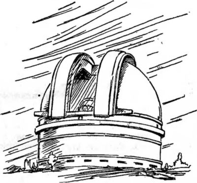 Замечательно, что астрономические приборы, которыми мы располагаем теперь, такие, как телескоп обсерватории Маунт-Паломар (рис. 7), уже способны проникать на расстояния, для которых скорость удаления равна 1/3 скорости света.