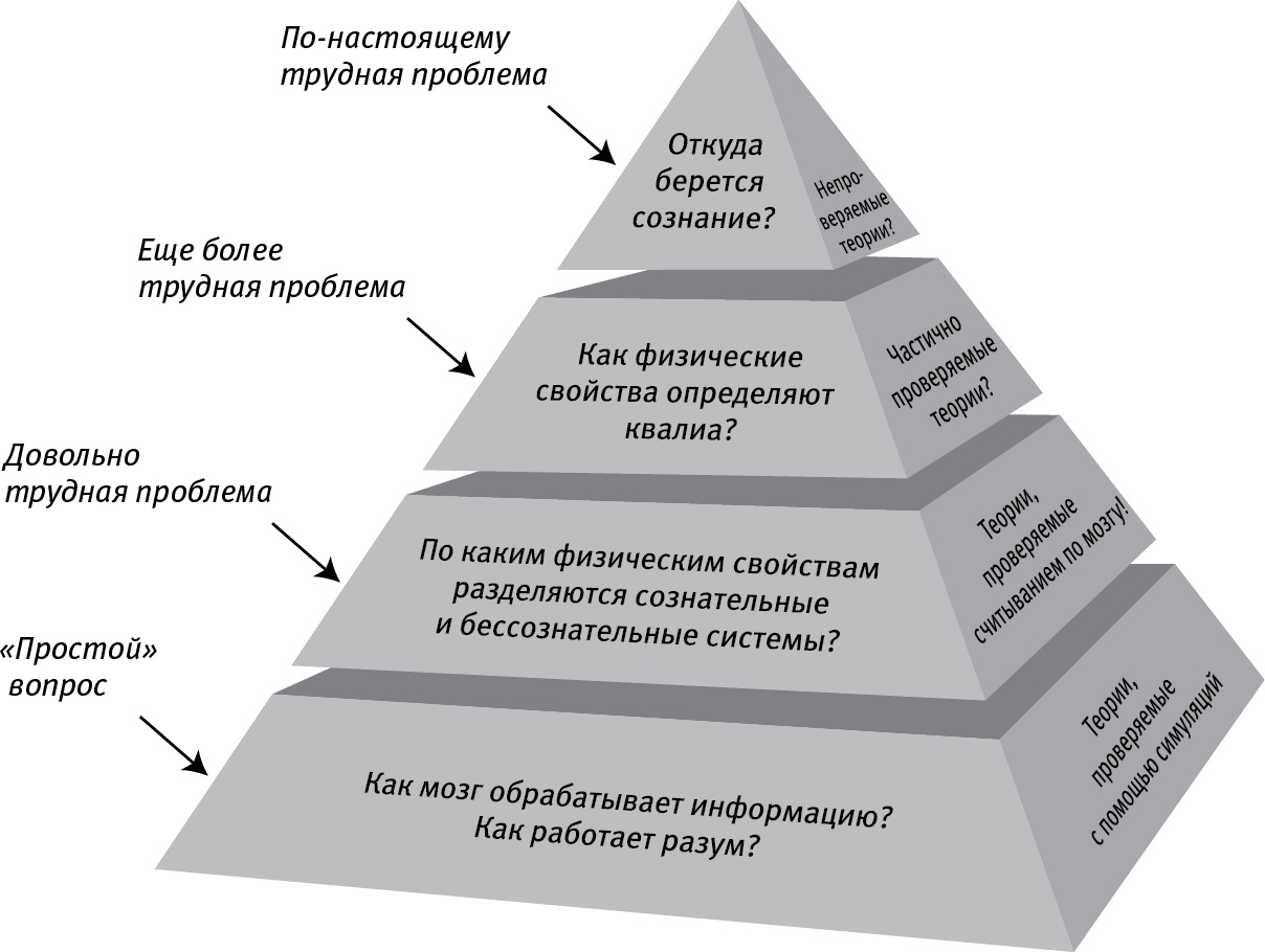 Понимание сознания предполагает целую иерархию проблем. Та, которую Дэвид Чалмерс называет «легкой», может быть сформулирована без упоминания личных переживаний. Очевидный факт, что некоторые, хотя и далеко не все, физические системы обладают сознанием, ставит перед нами три отдельных вопроса. Если у нас есть теория, дающая ответ на вопрос, который здесь обозначен как «довольно трудный», то эта теория должна быть экспериментально проверяема. Если проверка состоялась, то можно пользоваться ею в попытках дать ответ и на вопрос в вершине пирамиды.
