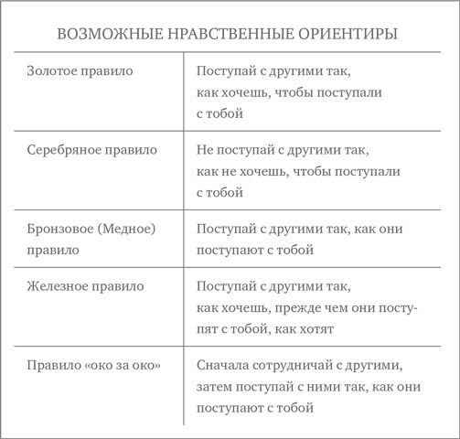 Из еще менее благородного металла «сделано» Железное правило: поступай с другими так, как хочешь, прежде чем они поступят с тобой, как хотят. У него есть и другая формулировка – кто оплачивает банкет, тот и заказывает музыку, – из которой видно, что оно не просто отмежевывается от Золотого правила, но и презирает его. Этим кредо втайне руководствуются многие, при условии что им за это ничего не будет, в том числе зачастую и власть имущие, хотя и не говорят об этом вслух.