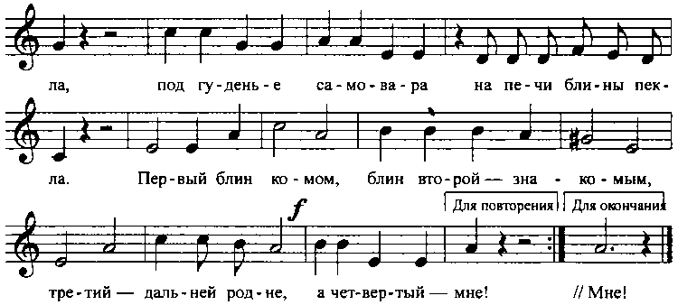 Звучит веселая, задорная русская народная мелодия. Праздник продолжается в гостях у бабушки Варвары и деда Егора — за самоваром и блинами. Вместе с ребятами угощаются Дуняша и скоморохи. Далее, на усмотрение музыкального руководителя, проводятся игры, аттракционы.