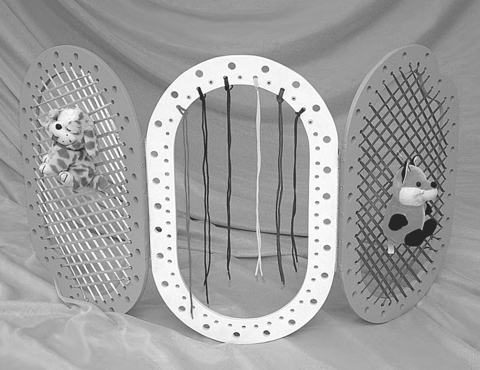 Универсальная ширма состоит из трех скрепленных между собой сквозных фигурных рамок, переплетенных тонкими ленточками (рис. 10). Множество отверстий разного диаметра по периметру рамок позволяет разместить на ней шнуры для плетения и завязывания узлов, ленточки для завязывания бантиков. Ширма оснащена дополнительными съемными элементами: непрозрачными шторками разного цвета, съемными тканевыми поверхностями с расположенными на них кармашками-накопителями, шнурами и лентами разного цвета.