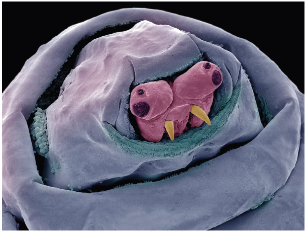 4. Голова личинки под микроскопом. Обратите внимание на два зубца, с помощью которых гниющее мясо отправляется в рот личинки.