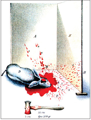 6. Иллюстрация из новаторской работы Эдуарда Пиотровского о пятнах крови. В ходе своих исследований он наносил животным удары с помощью разных инструментов и наблюдал полученную картину.