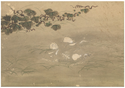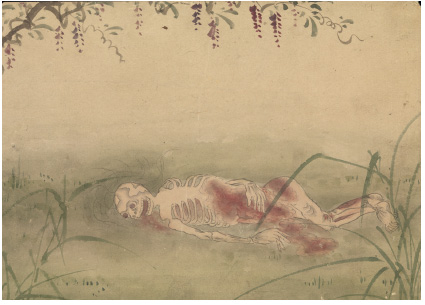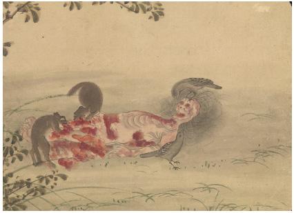 11. Смерть придворной дамы, из серии японских акварелей (ок. XVIII в.), изображающих девять стадий разложения трупа kus?zu: гниющим трупом питаются птицы и животные-падальщики.